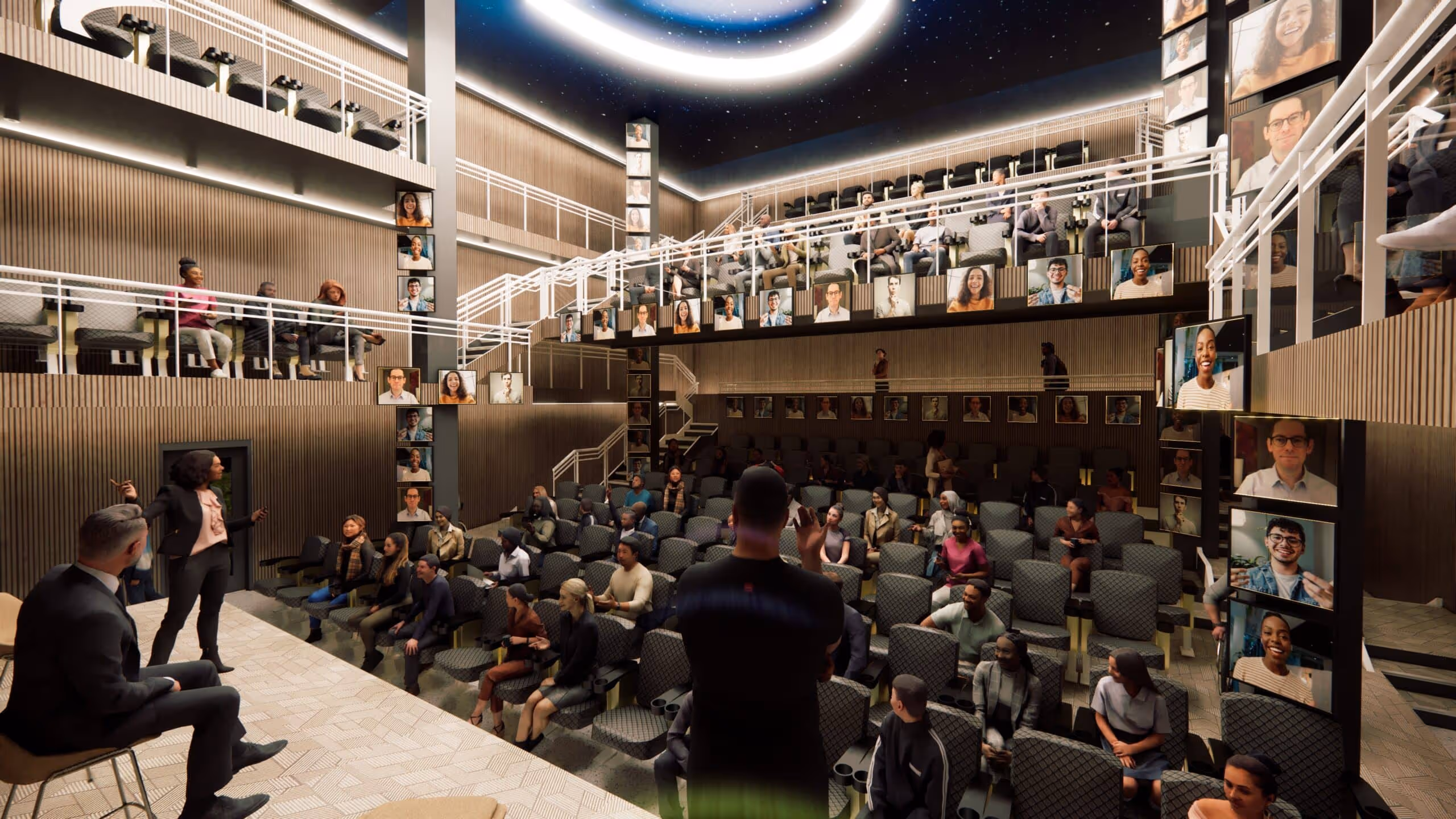 The Hybritorium is a first-of-its-kind venue built to seamlessly host hybrid events. Three tiers will hold about 220 seats. On the facings between the tiers, on the columns – and wherever there’s space – will hang around 120 monitors. When attendees reserve a ticket for an event, they’ll choose either a physical seat if coming in person, or a monitor if attending remotely. If remote, when the guest logs in, their face will appear on their specific monitor wherever it is in the Hybritorium. Each cluster of monitors has a camera and a speaker, so the remote attendee will see the stage from their actual monitor location. If they interact with the lecturer, the lecturer will hear them from their monitor, so they’ll turn and face the remote attendee just like they would when speaking with someone who is physically in the audience. Both in-person and remote guests appear on the big screen behind the lecturer, so that everyone can see and hear each other seamlessly.